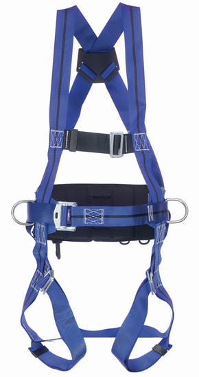 Arnés de 1 punto (anillo D dorsal), con cinturón, anillas en D laterales, hebillas de liberación rápida y correas de piernas ajustables.
